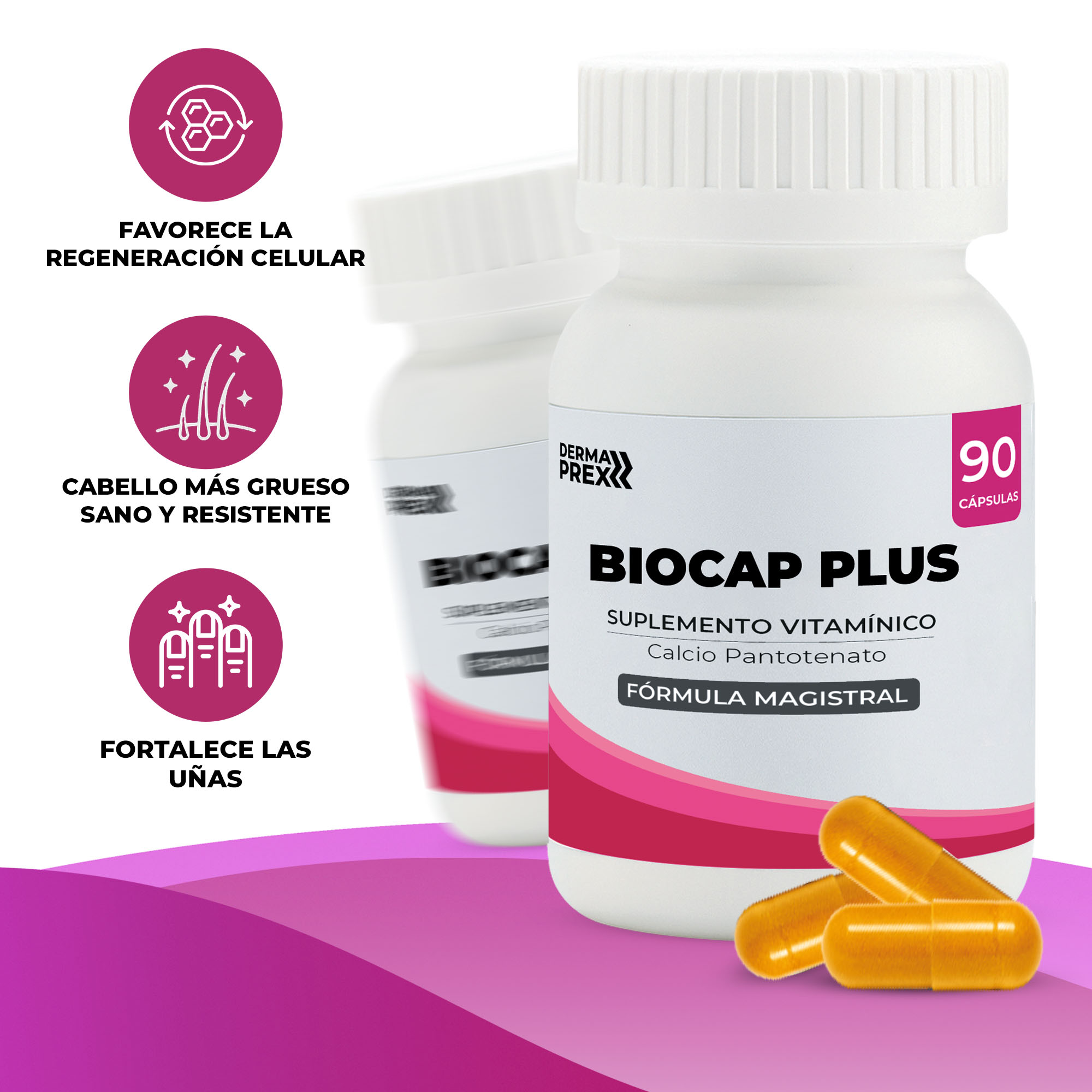 La fórmula aporta tres activos esenciales: Biotina, que promueve la producción de queratina; Calcio Pantotenato (Vitamina B5), que interviene en el metabolismo energético celular y crecimiento capilar; y Colágeno hidrolizado, que mejora la elasticidad y resistencia del cabello.